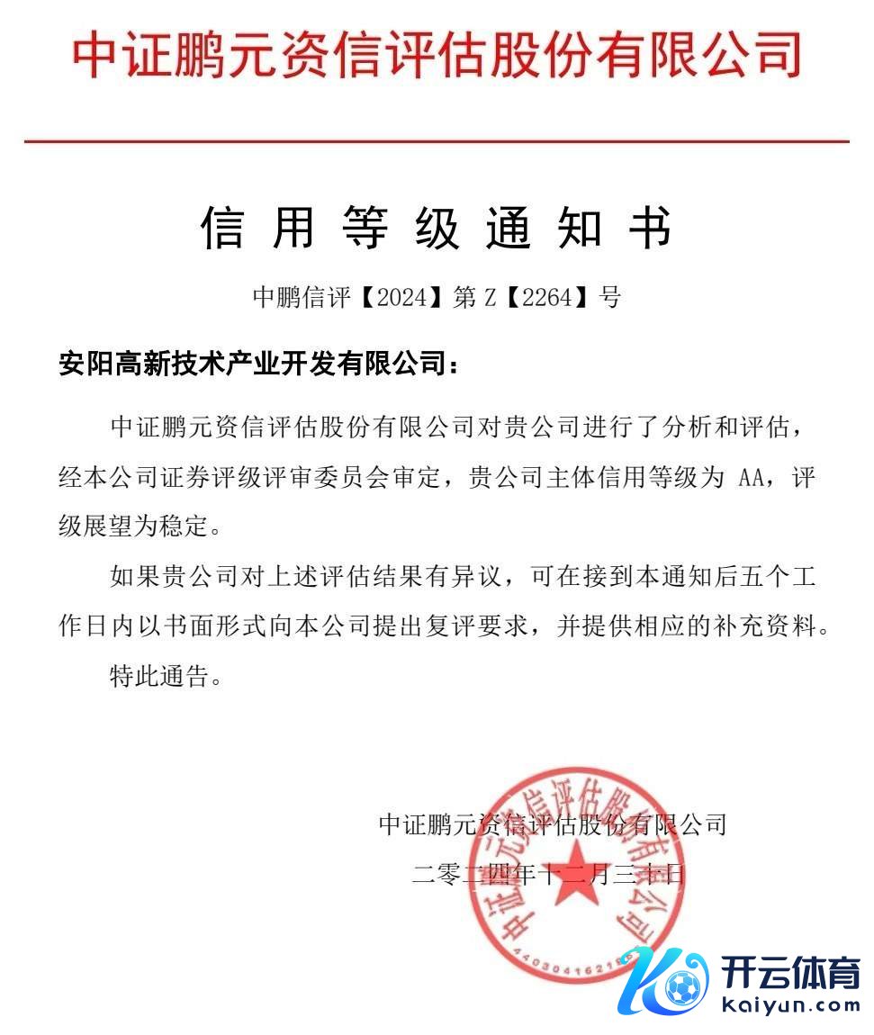 【大河财立方讯息】12月31日开云kaiyun,记者从安阳高新时刻产业开导有限公司(以下简称安阳高新产业公司)获悉,近日,中证鹏元资信评估股份有限公司赋予安新公司AA主体信用评级,评级瞻望为理解。