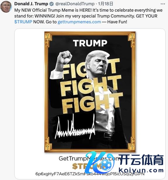 1 月 20 日,特朗普第二次抵达标志权力的白宫。而在总统履新庆典前两日(1 月 18 日),其在草率媒体上发文,秘书推出个东谈主 Meme 币" TRUMP ",配图照旧他高举拳头高歌"接触、接触、接触"的名风景。