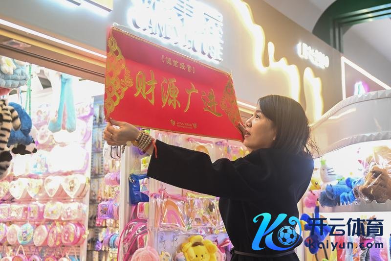 2月9日,义乌国际商贸城的商户在店铺门口张贴领取的新春横幅 新华社图