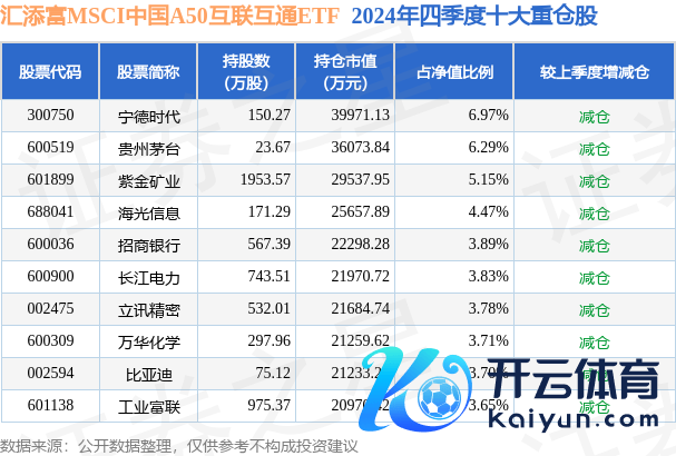 汇添富MSCI中国A50互联互通ETF为指数型-股票基金,凭据最新一期基金季报披露,该基金钞票竖立:股票占净值比99.82%,无债券类钞票,现款占净值比0.24%。基金十大重仓股如下: